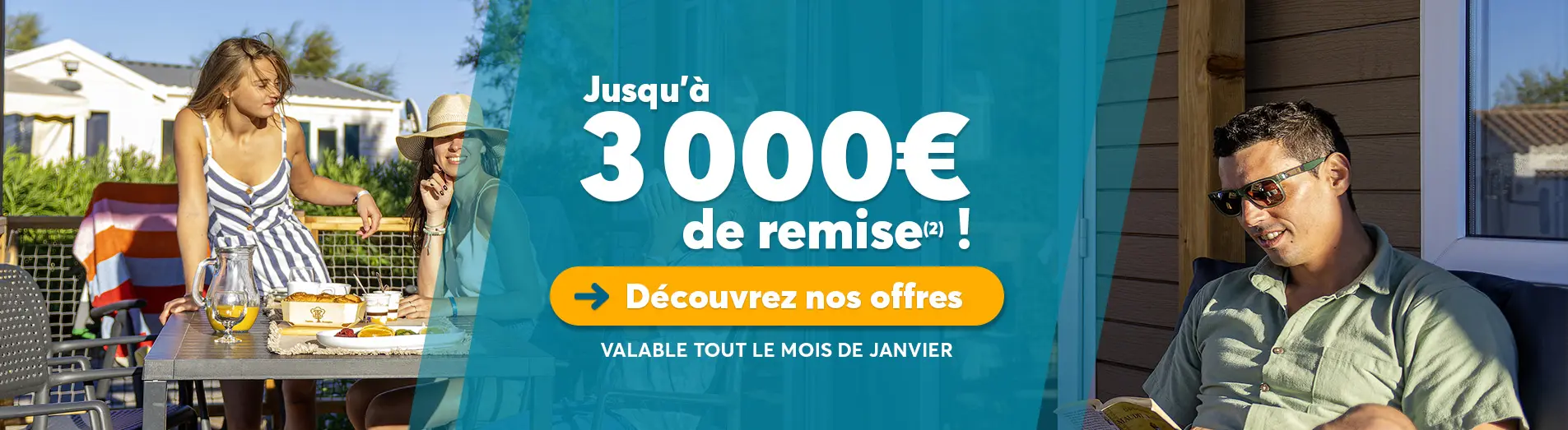 (2) Offre réservée aux particuliers, sous conditions, non cumulable : Pour toute signature d’un bon de commande sur un mobil-home dans un campings Homair Sweet mobil-home (hors mandat de vente) avant le 31 janvier 2026 avec une livraison prévue avant le 30 avril 2026, bénéficiez de :