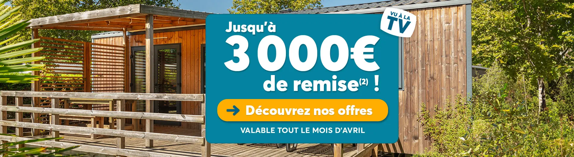 – de 3 000€ de remise immédiate sur le prix TTC, sur un mobil-home, hors mandats de vente, d’une valeur minimale de 35 000€ TTC.