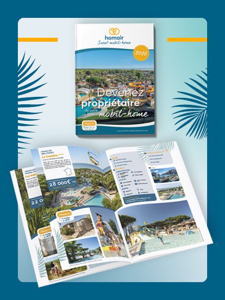 Plus de 80 pages avec les détails de l’offre Homair sweet mobil-home ainsi qu’un descriptif de tous les campings où vous pourrez acheter un mobil home neuf ou d’occasion