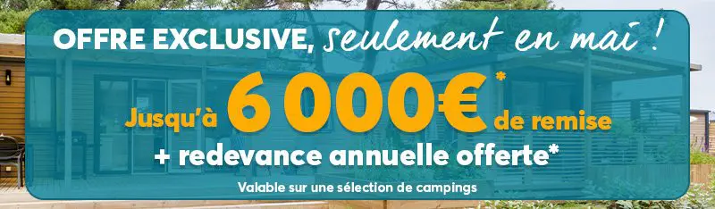 Ces remises sont doublées (soit 2 000 €, 4 000 € ou 6 000 € de remise immédiate TTC) et la redevance annuelle 2026 est offerte exclusivement pour toute souscription simultanée à une offre de gestion locative Optimum 6 B sur les campings suivants : Le Helles, La Pommeraie de l’Océan, Le Domaine du Logis, Les Fontaines, Aunis Club Vendée, La Pointe du Médoc, Le Parc des Allais et Val de Durance.