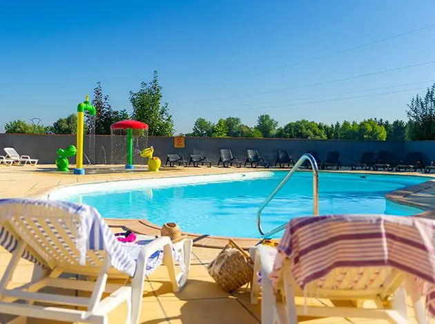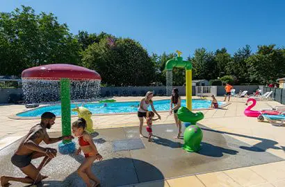 Le camping propose des infrastructures modernes, notamment un espace aquatique avec piscines intérieure et extérieure chauffées, ainsi qu’une pataugeoire avec aire de jeux aquatiques pour les enfants.