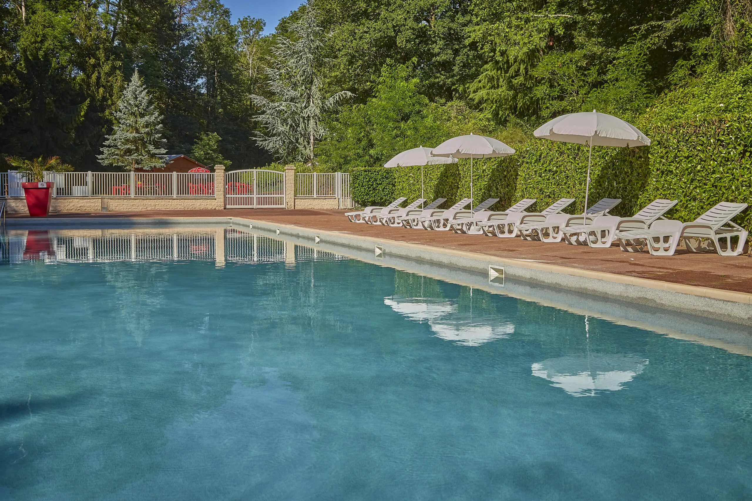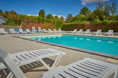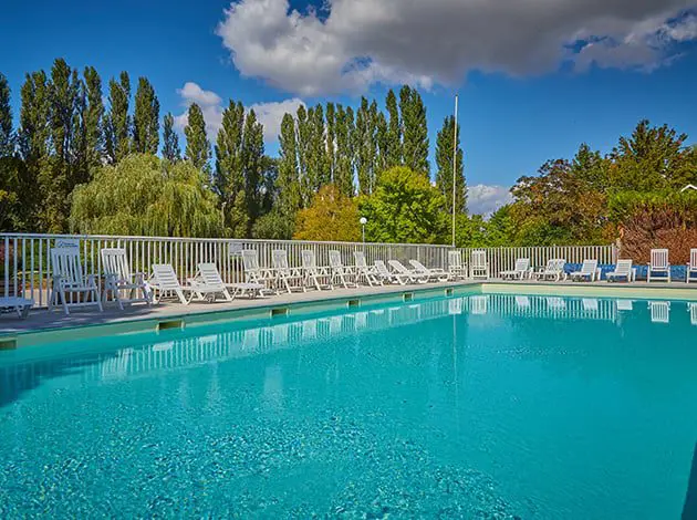 Le camping est marqué par une végétation luxuriante, avec des grands arbres d’ombre et des pelouses bien entretenues, créant une atmosphère apaisante idéale pour des moments de détente. Vous pourrez profiter de la piscine extérieure chauffée et du solarium pour vous relaxer au soleil, tandis que les enfants peuvent s’amuser en toute sécurité dans l’eau.